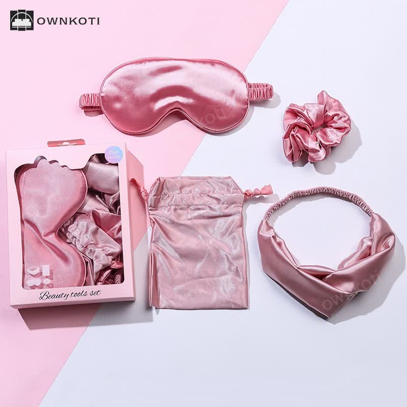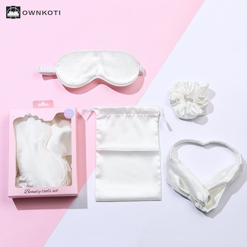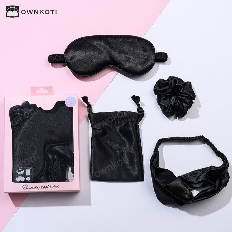 This four-piece set includes a smooth faux silk sleep eye mask, a scrunchie, a headband, and a convenient travel pouch, combining comfort and practicality. The eye mask is made of high-quality imitation silk fabric, providing an excellent light-blocking effect and helping you enjoy a deep sleep. The simple and fashionable design of the scrunchie and headband is suitable for all hairstyles and easy to fix. The travel pouch is convenient for storage, helping you organize all small items and easily take them out. Whether you use it at home or when traveling, it is a perfect and comfortable companion.