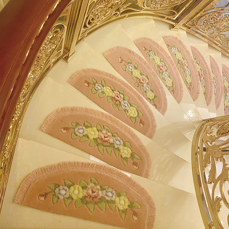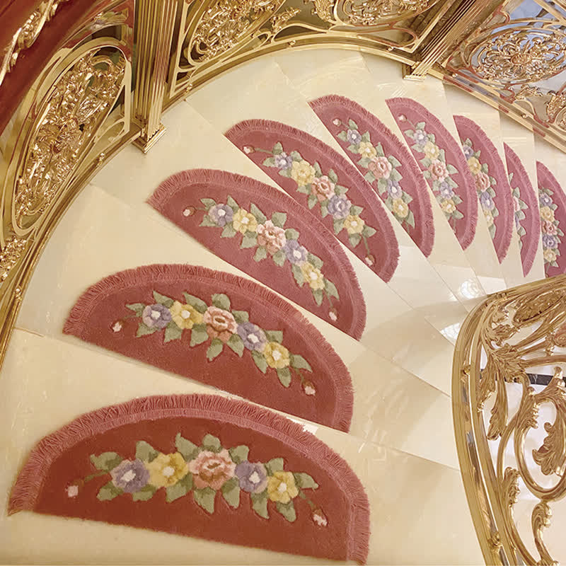 This stair mat features comfortable acrylic fabric and high-density material that protects your soles. The non-slip rubber backing ensures safety and easy cleaning. At about 1cm thick, it conforms well to foot soles. The thickened suede provides durability and resilience. Hand-cut floral craftsmanship enhances the three-dimensional effect, creating an atmospheric and vivid design.