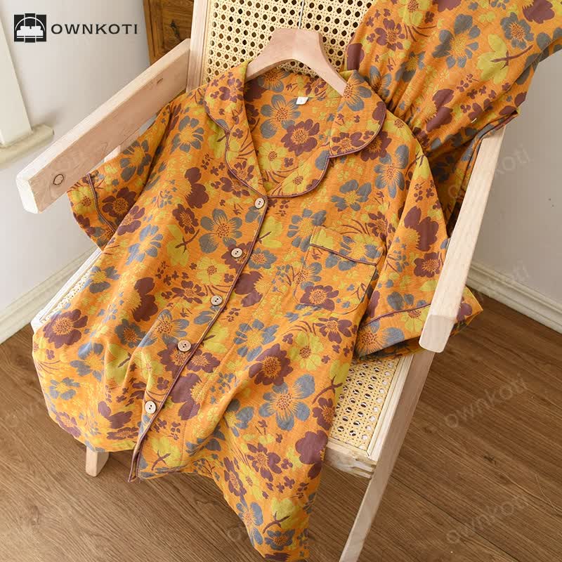 Discover the captivating floral design of our exquisitely patterned pajama set, which seamlessly blends luxury with vintage charm. Crafted from high-quality cotton, this fabric ensures exceptional comfort and breathability, offering you a soothing and relaxing experience.