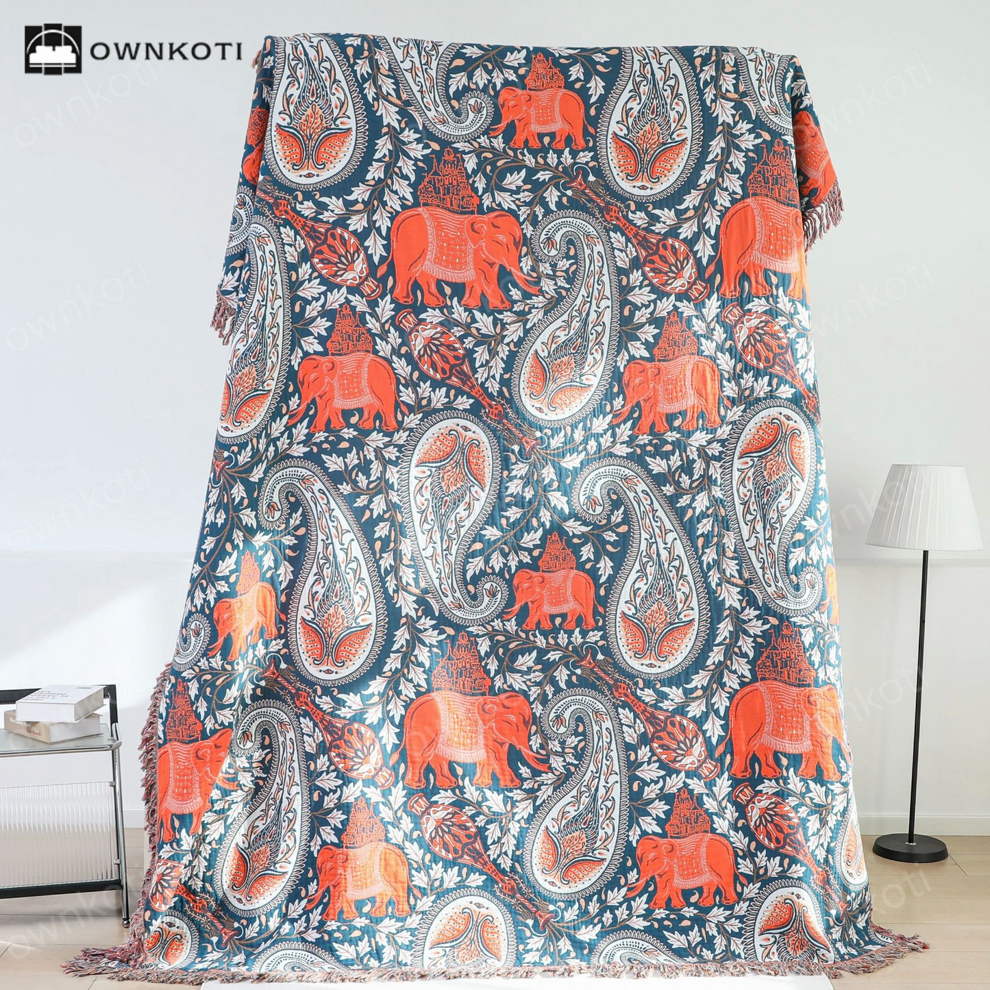 The blanket showcases an intricate paisley pattern with elegant elephants, adding cultural flair and artistic elegance to your decor. Made from high-quality cotton gauze, it is lightweight yet warm for year-round comfort, ensuring a cozy night’s sleep. Perfect for use as a couch or furniture throw, carpet, tapestry, bed or chair cover, or decorative tablecloth.