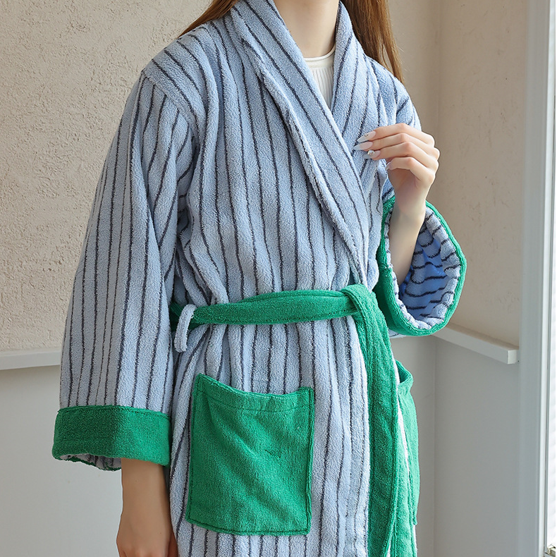 The high-quality cotton of this bathrobe feels soft against the skin and is breathable, keeping you cozy without overheating. With its charming striped design, it effortlessly blends simplicity and practicality. Whether you’re enjoying a relaxing morning, stepping out of the shower, or winding down in the evening, this stylish bathrobe is the ideal companion for your everyday rituals. Matching with towels to meet your daily needs.